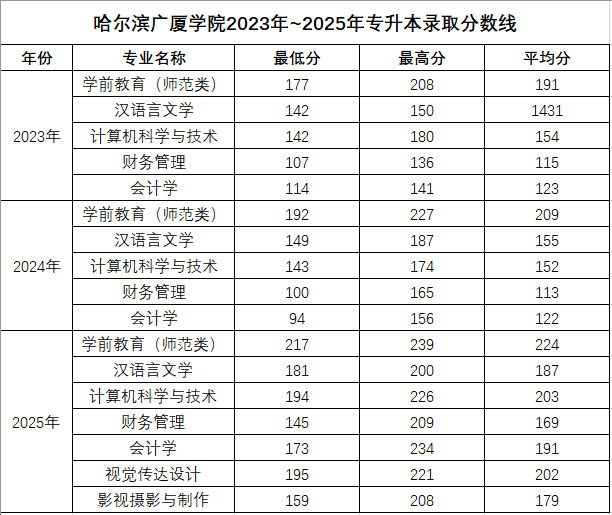 哈尔滨广厦学院2023~2025年专升本录取分数线